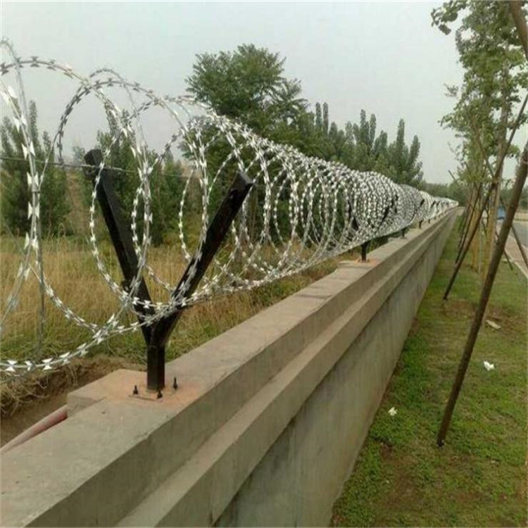機場圍界又稱機場圍網,是由 V型支架立柱和加強型焊接片網,安全防盜連接件和熱鍍鋅刀片剌網組成。 機場圍界頂部加裝刀片剌絲、刀片剌網后又很好的增強了安全防護性能。采用電鍍、熱鍍、噴塑、浸塑…