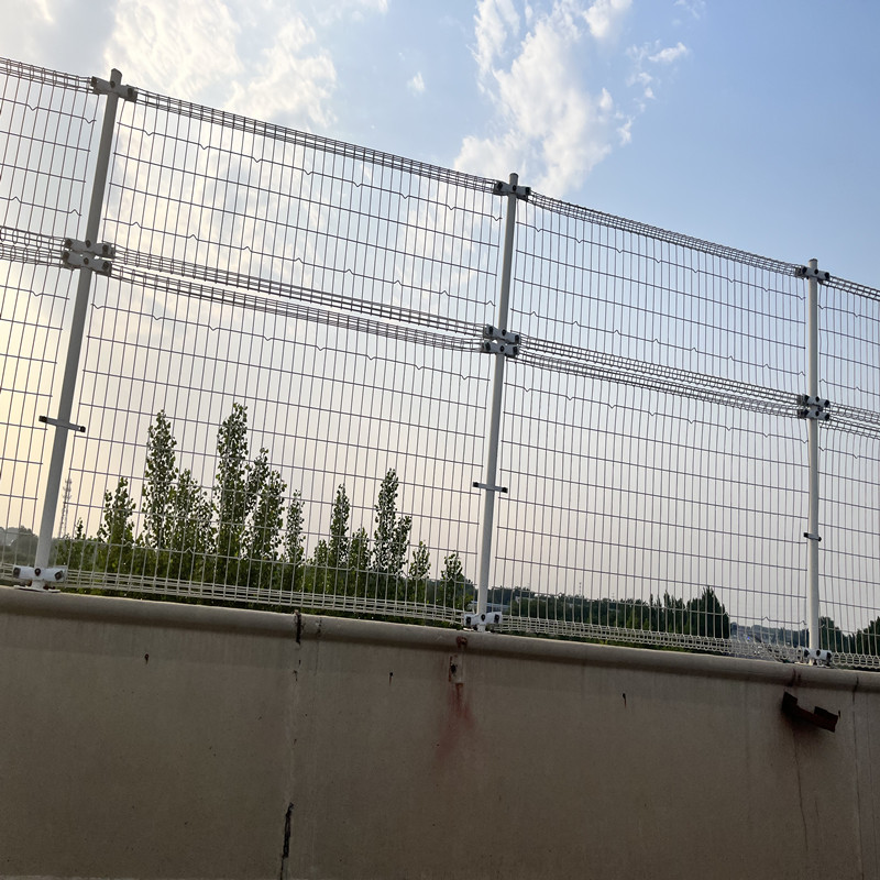 (四)雙圈防護網結構:用冷拔低碳鋼絲焊接成網筒狀卷邊與網面一體,用連接附件與鋼管支柱固定。特點:強度高、鋼性好、造型美觀、視野寬廣,安裝簡便,感覺明亮、輕松。(五) 機場專用防護網:本產品是專為機場設計的新型圍界產品,采用高強度低碳鋼絲強力焊接,立柱為矩形鋼及高強度圓管,頂部加焊V型支架,大大增強了圍網的抗沖擊力,頂部在增加刀片刺絲后又很好的增強了安全防護性能,國內外大型機場已廣泛采用此種產品,并得到了極大的認可。