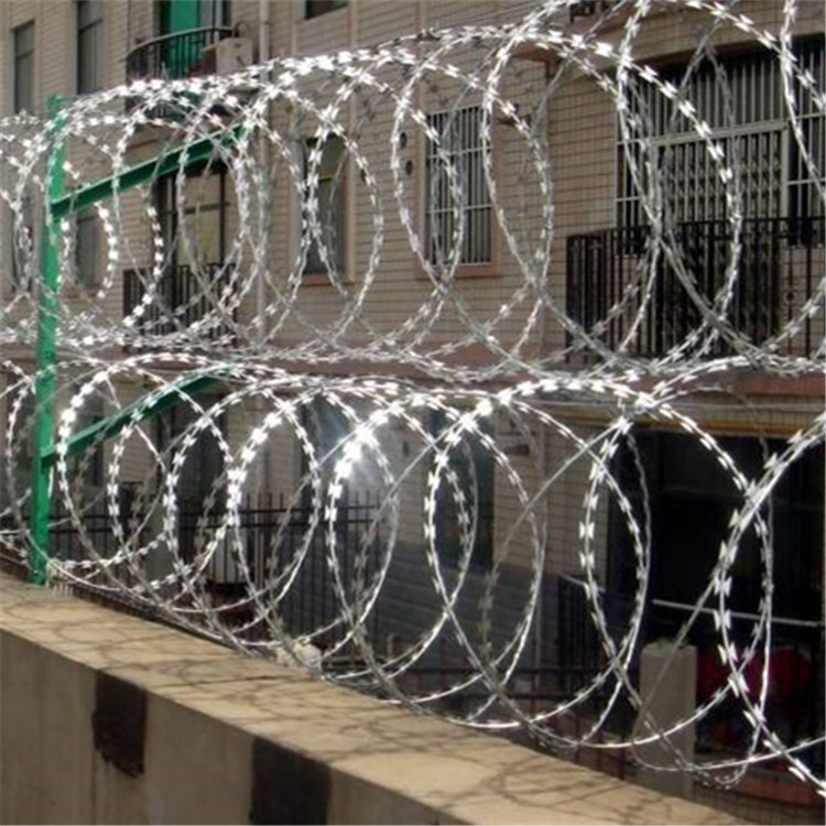 它是用不同材質的鋼板與不同材質的絲兩種原材料組合而成,先把所需材質的鋼板沖壓出刀片的尖刀直條,在和所需材質的絲包裹在一起,在制作出我們所需要的圈直徑即可,刀異常的鋒利,只要觸摸到就會被刺傷,不可能讓非法分子有攀爬翻越的機會,是現代社會各場所圍墻安裝的最佳防護隔離網。