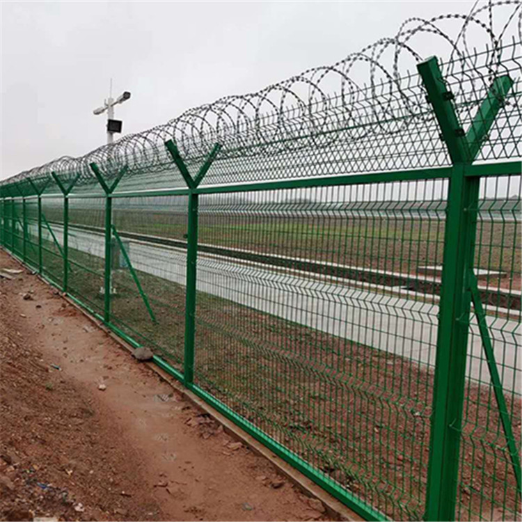 機場圍界又稱作“機場護欄”、“Y型安全防御護網”,它是由V型支架立拄,加強型焊接片網,安全防盜連接件和熱鍍鋅刀片剌籠組成。經過一番編織、加工后,才形成的具有隔離、防護功能的圍欄設施。