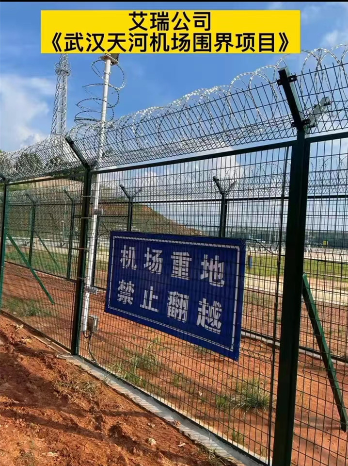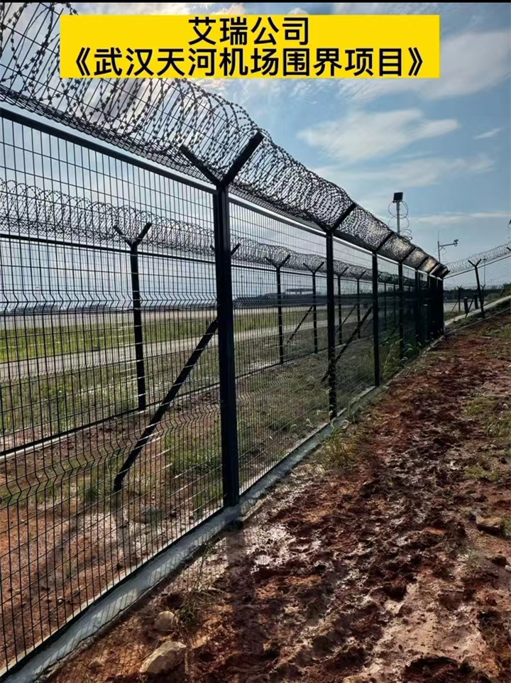機(jī)場圍界又稱作“機(jī)場護(hù)欄”、"Y型安全防御護(hù)網(wǎng)”, 它是由V型支架立拄 ,加強(qiáng)型焊接片網(wǎng),安全防盜連接件和熱鍍鋅