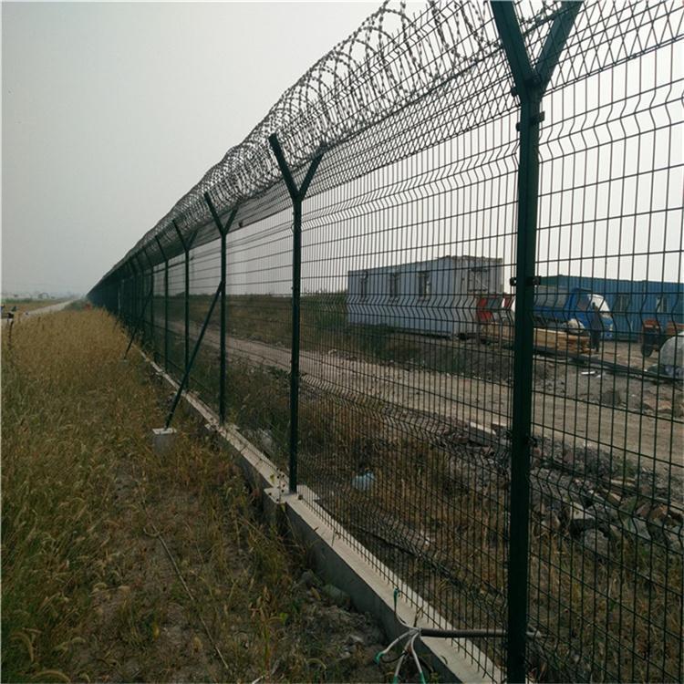 機場護欄網又稱作“V型安全防御護網”,由Y型支架立拄,加強型焊接網,安全防盜連接件和熱鍍鋅刀片刺網組成,是強度和安全防御性