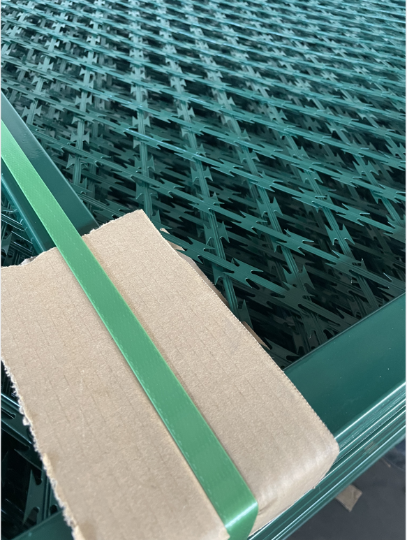 四,接下來就要焊接隔離網(wǎng)了。將焊接好的刀刺網(wǎng)按照施工圖紙對網(wǎng)面進行進一步處理,焊接好邊框和立柱后就可以進行表面處理了。