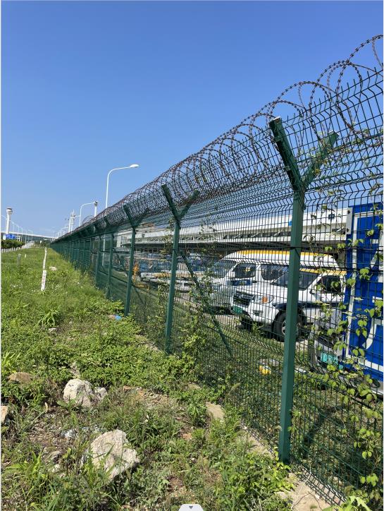 民用機場圍界網工程采用鋼筋圍界網,機場鋼筋網圍界采用優質低碳鋼材制作,表面進行浸塑處理不單單提高了防腐蝕能力,更是提高圍界網的美觀性能。